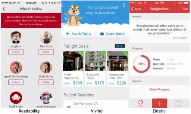 Readability采用紅色主色調(diào)設(shè)計,連提示信息背景色、線性按鈕和圖標都采用紅色主色調(diào),界面和LOGO也完全是一個色系的。而Vivino采用藍色主色調(diào)設(shè)計,信息用深藍、淺藍加以區(qū)隔。Eidetic采用橙色主色調(diào)設(shè)計,其中的關(guān)鍵操作按鈕甚至整個用橙色提亮,信息圖標也用深橙色、淺橙色來表達程度。 可以說唯一主色調(diào)設(shè)計手法,是真的做到了移動端APP的最小化(Minimal)設(shè)計,減少冗余信息的干擾,使用戶專注于主要信息的獲取。
