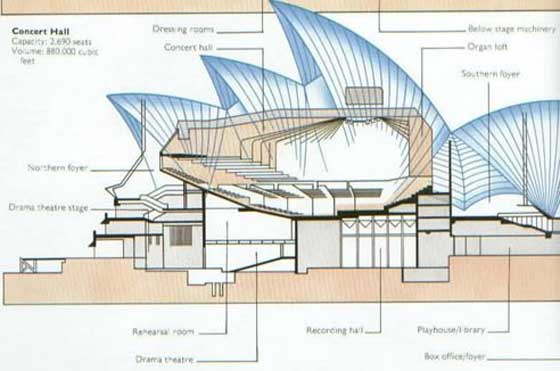 , 在最后找到一個經濟上可以接受的解決辦法之前,設計隊伍反復嘗試了12種不同的建造“殼”的方法(包括拋物線結構,圓形肋骨和橢圓體)。后來團隊中的某個 人建議將所有球形房頂,在同一個巨大的同心圓上切割出來。該辦法可以使用一個共同的模具澆注出不同長度的圓拱,然后將若干有著相似長度的圓拱段放在一起形 成一個球形的剖面。究竟誰是這個解決辦法的發明者至今都是爭論的話題。 深化設計后的歌劇院變成了一個暖壺,內外被分成了壺膽和壺罩的關系,這是建筑史上思想的一次突破,從此有一種建筑它的立面和內部空間可以毫無關系了,所謂表現主義建筑就在這個蛋殼下誕生了。 當然制作這個“殼”是要付出代價的,悉尼歌劇院的“殼”由著名的建筑商Hornibrook Group Pty Ltd負責建造,Hornibrook在工廠中制成了2400件預制肋骨和4000件屋頂面板,加快了工程的進度。這個解決辦法的成就在于利用預制混凝土 構建從而避免了建造昂貴的模具(他同樣允許讓屋頂面板在地上就大片的預先建造組合好,而不是在高處一個一個的拼接上)。Ove Arup和合作方的工地工程師驚訝于這些“殼”在完工前使用了創新的調節型彎曲鋼鐵桁構梁來支撐不同的屋頂。 第三個大麻煩幾乎使工程被擱置了,悉尼歌劇院的屋頂是由2194塊每塊重15.3噸的彎曲形混凝土預制件,怎樣的力學結構才能讓這些水泥砣安全地架在上 面,這是所有結構工程師不曾遇到的挑戰,大家都沒了信心,這是掉腦袋的活呀。主意還是來自門外漢,烏特松看見孩子玩的提線木偶,放在桌子上的時候是一灘爛 泥,把線體起來就精神抖擻了。最后工程師們用鋼纜把所有的預制構建拉緊拼成的一體,屋頂的重力被每一個角度的部件分散了,這是建筑業上的一個偉大創舉。 第四個大麻煩幾乎是無法逾越的,也是工程師們永遠解決不了的,那就是預算不準確帶來的巨額超支。這個建筑本來的預算是700萬元,但最終的造價高達1億2 千萬元以上,為此州政府幾乎一度破產,歌劇院成為全體澳大利亞人的一塊心病。為了籌措建造悉尼歌劇院的資金,卡希爾開始發行悉尼歌劇院的彩票。漸漸地設計 師烏特松成了悉尼的千古罪人,所有人都開始詛咒這個半路出家的二把刀。他與州政府的關系也慢慢開始惡化,最終雙方選擇決裂,1966年烏特松辭職而去,并 且發下誓言從此在不登上澳大利亞的國土。 我們的總設計師甩手走人后,原設計師團隊中的澳大利亞設計師們肩負起了歌劇院繼續修建工作,愛國主義和責任心支持者這些人在痛苦中掙扎,麻煩一個接著一個 出現,但是解決麻煩的創意又一個一個誕生了,工程時干時停。整個州政府算是被綁架了,總不能扔個爛尾樓在悉尼市最美麗的港灣上吧?繼任的設計師們總體上堅 持了烏特松的設計理念,只有在最后的裝修階段,選擇了更為粗狂的風格,看上去像是一個大毛坯房,而不是烏特松這位瑞典家居設計師腦海里原本想像的奢華浪 漫,一方面是因為七十年代的時候水泥建筑非常流行,另一方面可能也是很大的原意就是建造悉尼大劇院的整個過程中一直都是缺錢的狀態。 除了建筑結構部分的精彩,這部建筑作品還在有著建筑業內另外的成就,首先是屋頂的瓷磚,在建筑的設計初期,很多人就提出了該建筑清洗方面的質疑,烏特松開 始設想一種不用清洗的方式解決它,一家丹麥的瓷磚公司為此投入了研究。最后悉尼歌劇院的屋頂覆蓋著105萬塊白色或奶油色的瓷磚,瓷磚是亞光與拋光的相間 排列,在太陽光的照射下閃閃發光。瓷磚經過了特殊處理,因此不怕海風的侵襲,也不需要清洗。對于一個1958年的建筑來說, 另外一點,整個悉尼歌劇院采用的是集成式設計體系,所有的地板都是水泥預制件,用四條螺絲固定在地面上,隨時可以拆卸掉起,這為維修地面下面的管線提供了 最好的解決方案,這在上個世紀五十年代也是第一次有人嘗試的建筑方法。還有一點更加令人驚嘆,這個劇院沒有空調系統,它的恒溫系統來自周圍的海水。一系列 工程學、材料學、建筑學、設計學上面的突出表現,讓悉尼歌劇院成為了人類建筑史上的璀璨明珠。 經過了千辛萬苦的努力與堅持,悉尼歌劇院最后在公元1973年10月20日正式開幕。開幕式邀請了英國女王親臨現場。悉尼歌劇院在英國女皇伊麗莎白二世