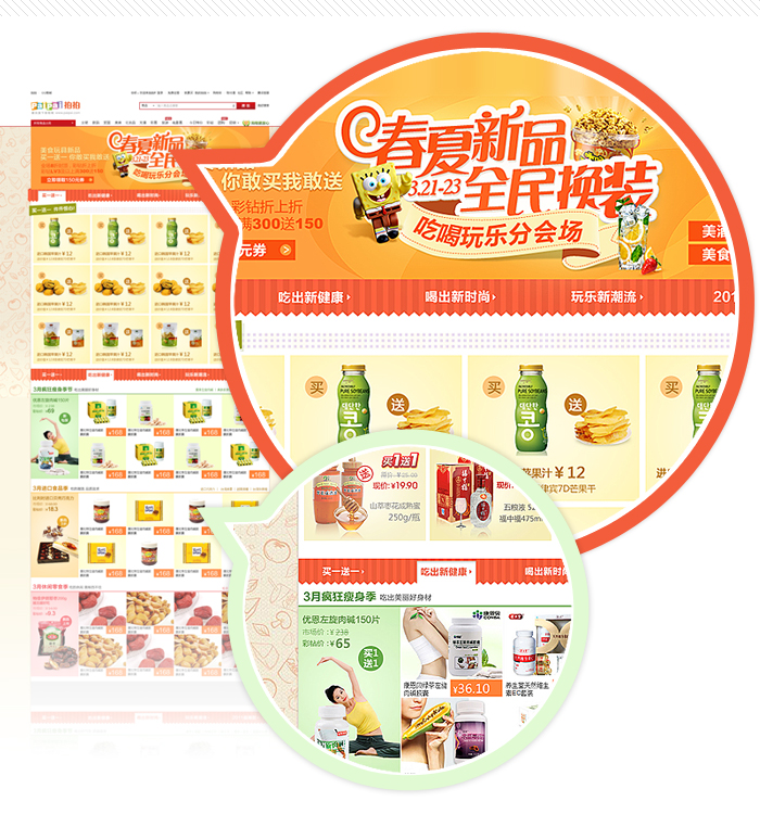 3月促食品分會場運用鮮明的色彩,大背景采用不同食品線稿大小不一、層次分明的組合,渲染出美食熱鬧的氛圍,從而提高消費者的購買欲望