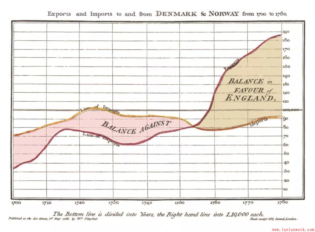 更為現代的信息圖表歷史可能始于William Playfair,他是統計圖形學的早期創新者。1786年,他出版了商業和政治地圖集,其中顯示了許多代表英格蘭經濟的條形圖,折線圖和直方圖。他在1801年用第一張面積圖和第一張餅圖進行了跟蹤。