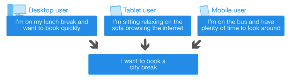 過去,我們通常會假設用戶在使用移動設備訪問網站時,其行為都是高度目標驅動化的,例如在旅途中獲取酒店地址、預訂房間一類。但實際情況不僅如此——智能手機、平板電腦等各類移動設備的用戶,會越來越多的在相對穩(wěn)定從容的狀態(tài)下使用網絡。所以在很多時候,用戶使用不同設備的目標差別并沒有想象的那么大,我們不能片面的假設不同類型設備的用戶對功能的需求差異。