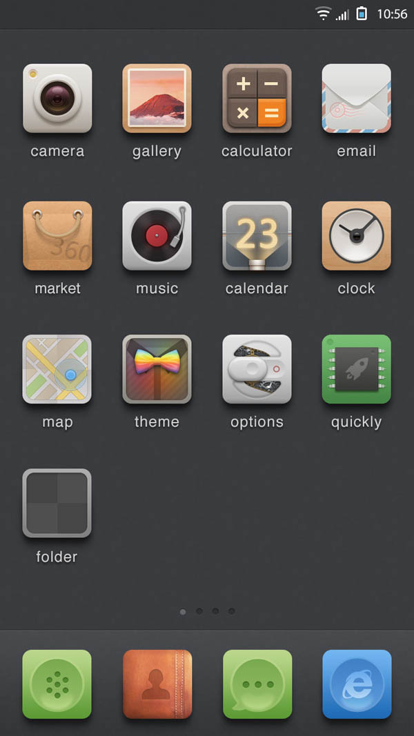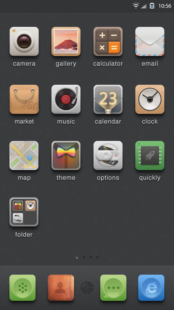 《優格主義》為簡約擬物設計風格,微起伏,輕材質,中性配色,嘗試創造一些視覺亮點。主題背景沿用了由錘子系統引領的深色系簡約風格,給圖標提供一個良好的展示平臺。以舒適性和易辨識性為核心設計原則。希望你能喜歡!