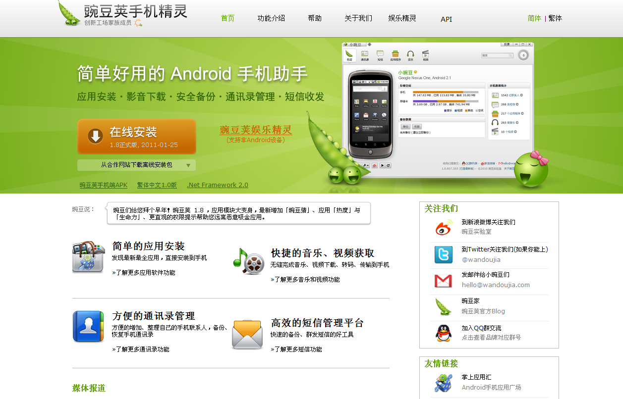 5 豌豆莢手機精靈官網(wǎng),非常實用的應用軟件類布局,功能、關注、宣傳、友鏈布局合理,大大的焦點圖上書:在線安裝,用戶下載方便。該有的都有,所以在意料之中,相對平常。