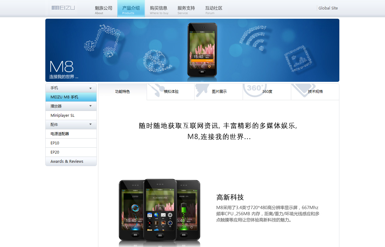 4 魅族公司官網(wǎng),也是藍藍個人非常喜歡的風格,格局大方,恢宏穩(wěn)重,沒有多余的東西,極簡單而條理清晰,重點的圖設計精致、表達需求明確,而且唯美,大量空白顯的頁面不擁擠,有想象的空間。