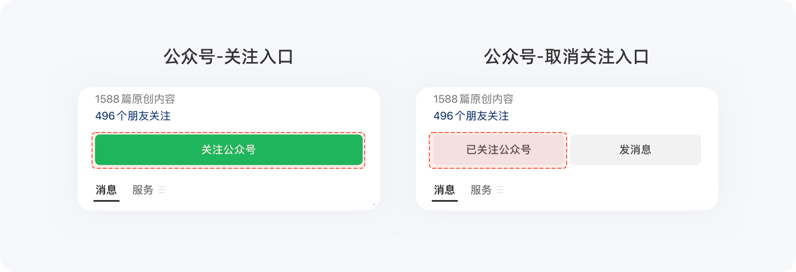 有時候,出于商業化的目的,同一個選項在二次操作時,產品會刻意增加用戶操作成本,以降低選擇效率,看似??硕傻姆聪虿僮?,卻一定程度地降低了用戶退出率,實則對產品有益。例如,在關注微信公眾號之前,非常醒目的關注按鈕觸手可及,可關注之后,弱化的幽靈按鈕及文案,很難一眼看出這就是取消關注入口,需要用戶花費額外的時間去理解或試錯方可取關,這么做能降低公眾號粉絲的取關量。為公眾號留住粉絲,更是對內容認可的一種支持,后面的良性循環無需多講。
