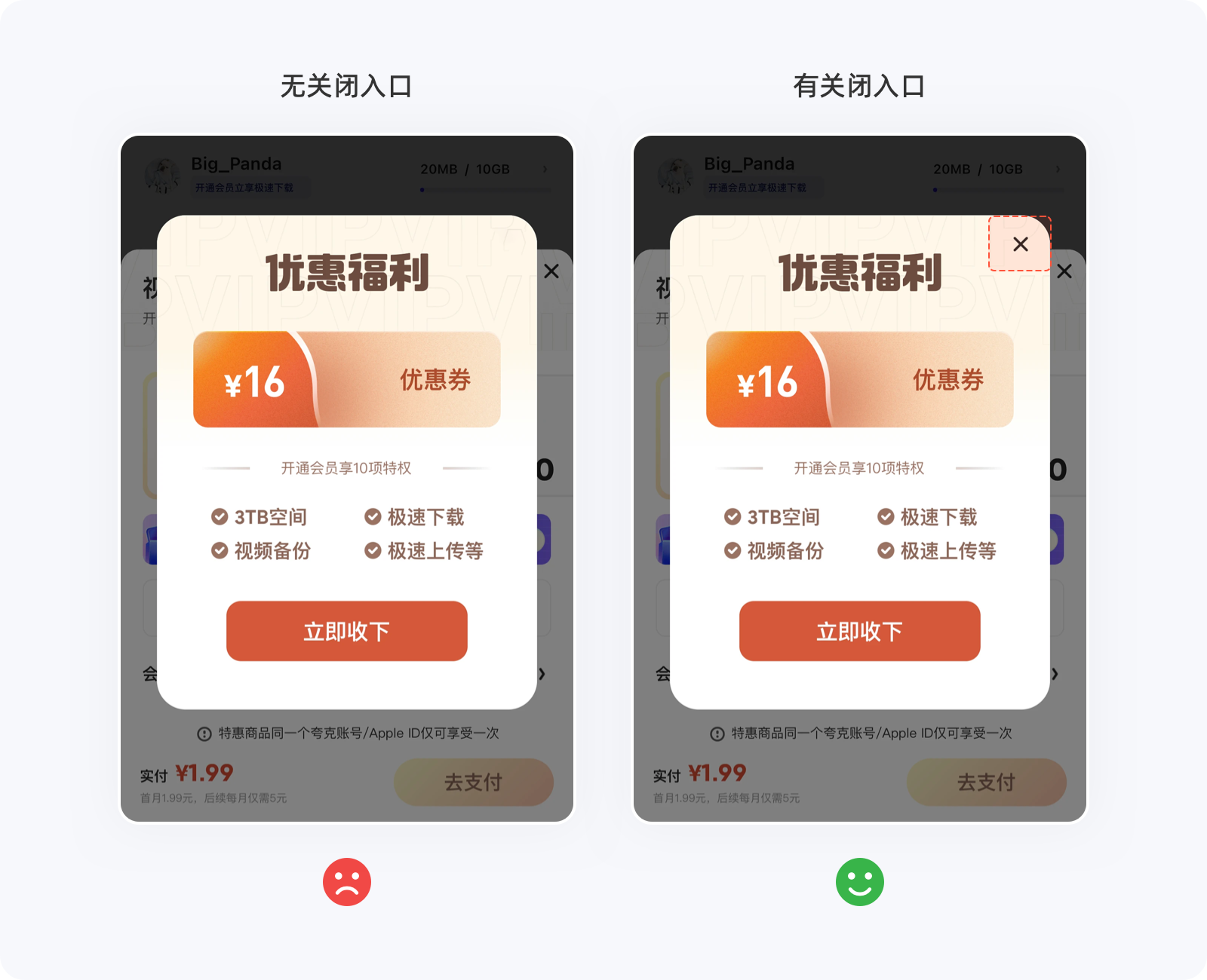 ??硕梢龅氖峭ㄟ^減少用戶做決定的時間,來提升轉化率以及用戶體驗,但不管在什么情況下,用戶都希望自己還擁有選擇的權利,如果設計師自作聰明的將選項減到只剩一個,就相當于告知用戶必須接受,那么用戶就有種被強制、綁架的感覺,只會存在兩個結果:①被你的產品拿捏、②離開你的產品,筆者相信第一種可能性的概率極低,畢竟同類型的產品并不是只有你一家(壟斷除外)。如下圖的彈窗,用戶即便不愿意進入任務流程,可別無選擇,只能進入后再返回才能回到原位,這種做法無端增加用戶的操作成本,極易引起反感情緒。不管產品如何希望用戶轉化,切不可強制他們接受,需要給用戶留一條返回的“路”,即便不那么起眼,至少還有選擇的權利。