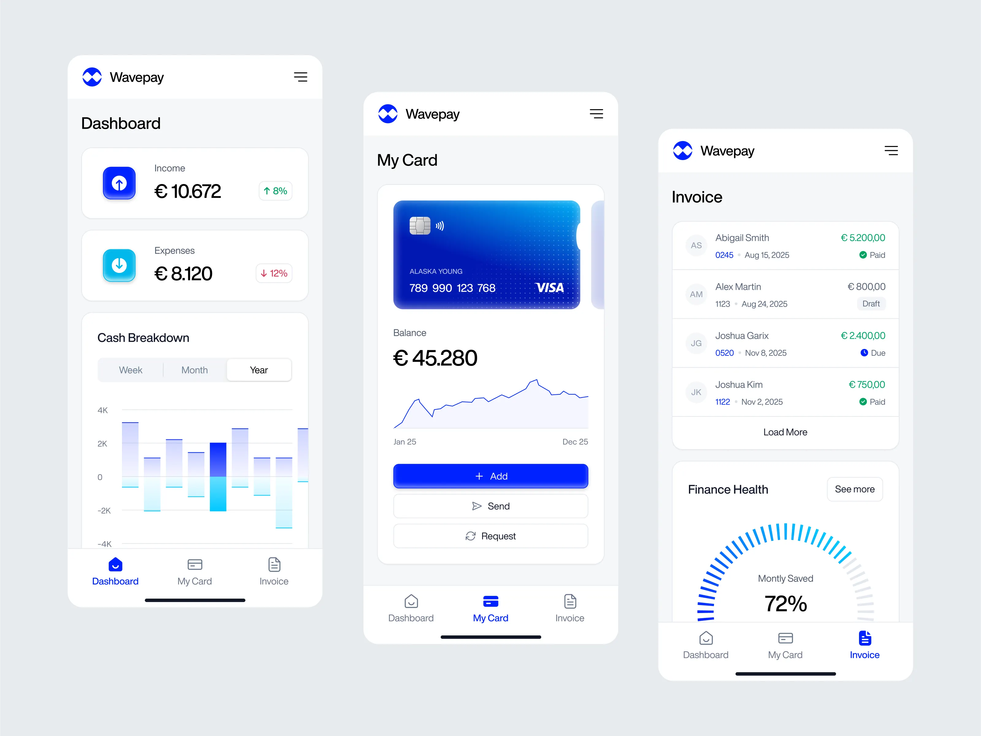 • 扁平化 + 微擬物:大部分界面遵循扁平化(Flat Design),但在圖表陰影、卡片圓角上有輕微擬物感,屬于當下流行的“新擬物/柔性UI”趨勢。