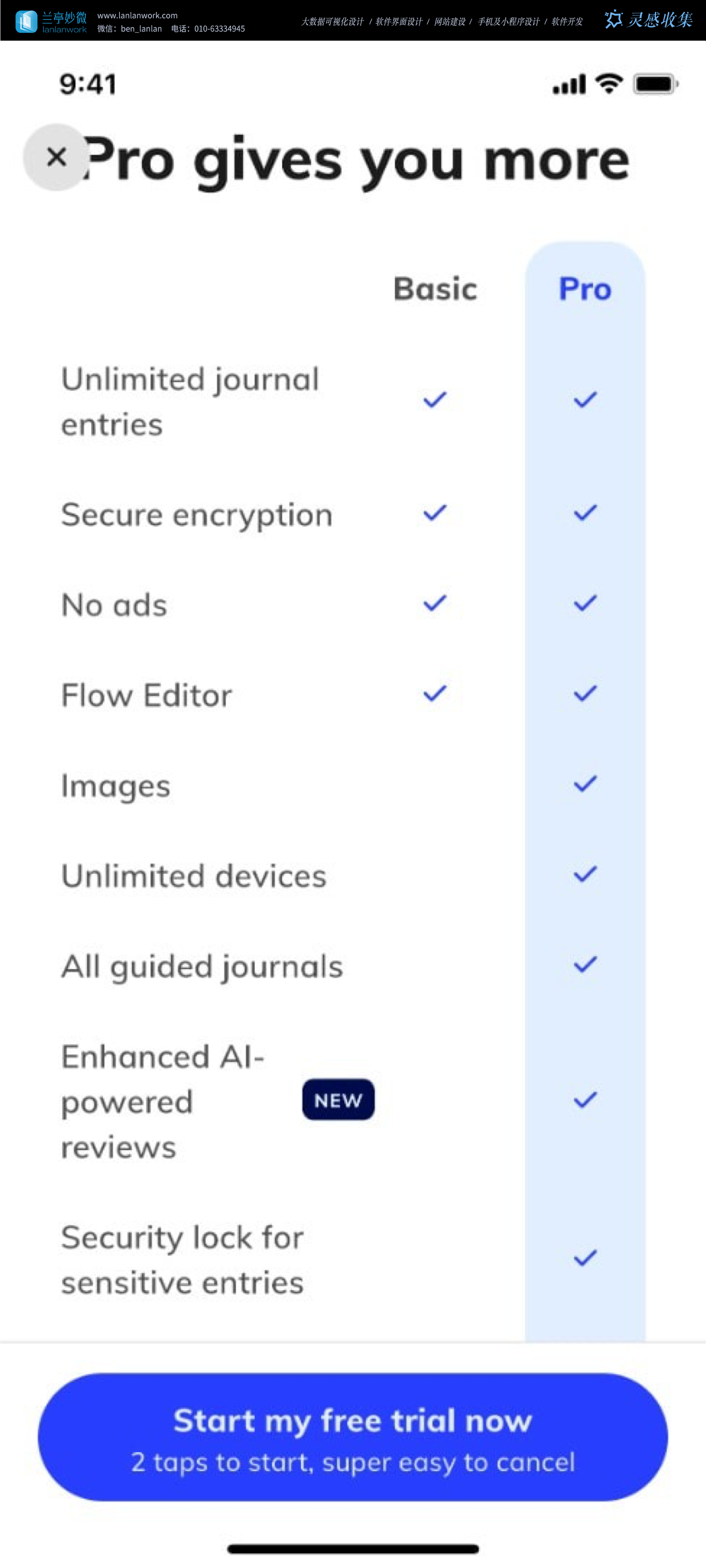 在視覺風格上,語言學習類界面用漸變色彩和卡通形象營造活潑氛圍,工具類則以黑黃撞色凸顯專業感;信息架構上都遵循 “價值傳遞 - 選項展示 - 行動引導” 邏輯,或通過量化數據、功能列表展現付費價值,或通過試用周期、套餐對比、功能表格降低決策門檻;交互設計突出 “免費試用” 按鈕,利用色彩對比引導視覺焦點,同時在試用規則上強化用戶安全感。整體通過場景化視覺、分層信息傳遞與安全感交互細節,構建從認知到轉化的完整路徑,為訂閱制產品商業化設計提供多元參考。