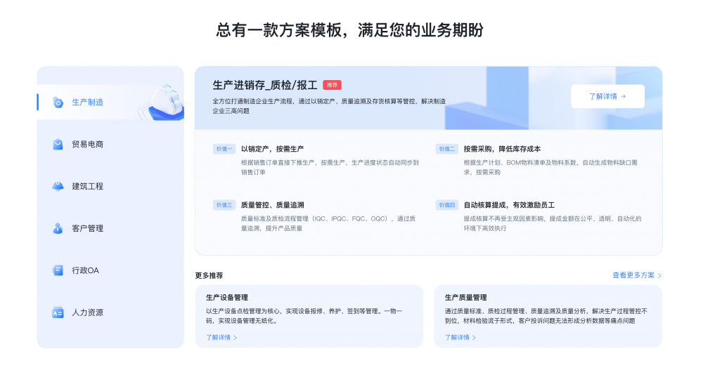 • 問題 - 方案” 式引導(dǎo):在產(chǎn)品介紹頁(yè)加入 “你是否遇到 XX 痛點(diǎn)?我們的方案是 XX” 的邏輯,比如案例中 “生產(chǎn)設(shè)備管理” 板塊對(duì)應(yīng) “設(shè)備維護(hù)難、效率低” 的痛點(diǎn)。
