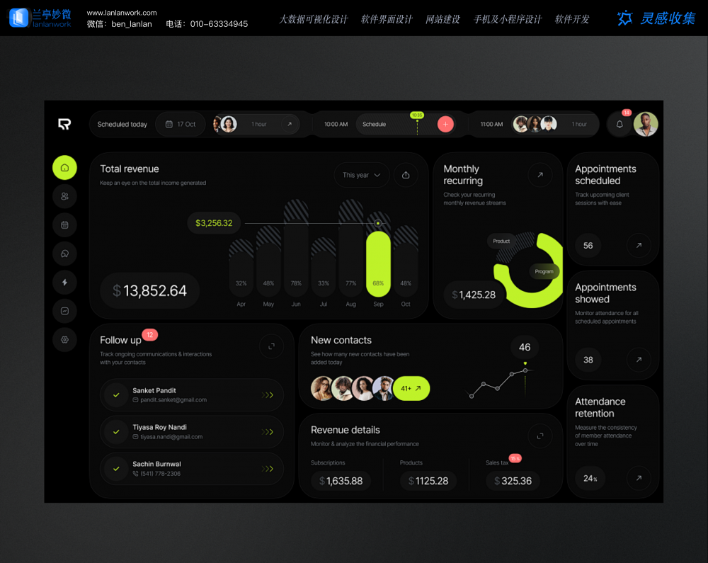 這 5 組界面都采用深色底色搭配低透明度肌理,和蘭亭妙微打造后臺管理系統(tǒng)首頁設(shè)計的思路高度契合。首圖企業(yè)服務(wù)首頁的深黑 + 淡紫漸變,既營造出科技感,又不會讓視覺過于雜亂;加密貨幣后臺的暗紋處理,貼合區(qū)塊鏈業(yè)務(wù)屬性的同時,還能讓核心數(shù)據(jù)更突出。