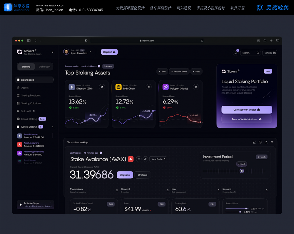 找不到按鈕、分不清功能區(qū)?這組設(shè)計的視覺引導(dǎo)堪稱教科書。每個界面只選 1 種高飽和強調(diào)色,核心按鈕用高亮 + 留白突出;功能區(qū)用卡片 + 淺陰影分層,像加密貨幣后臺的質(zhì)押資產(chǎn)模塊,清晰得像文件夾,新人上手不用看手冊。
