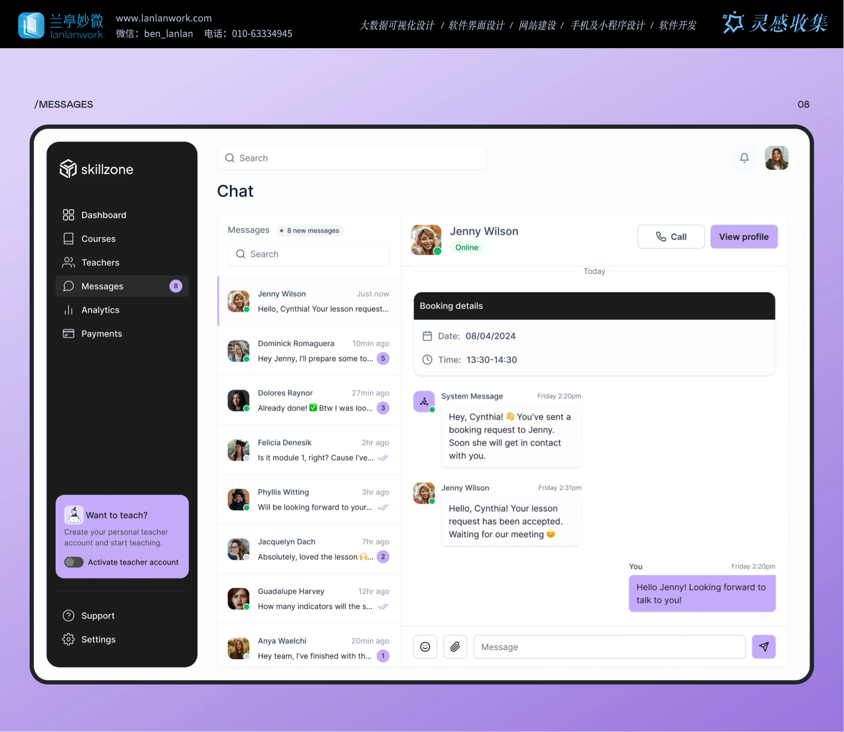 足多樣教學需求。消息模塊里,聊天界面實時顯示在線狀態、課程預約詳情,師生溝通方便又順暢。這些貼心設