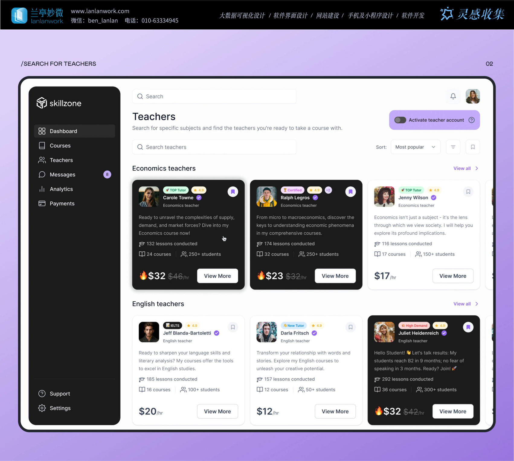 Skillzone 選用柔和的紫色為主色調,紫色常給人智慧、有創造力的的感覺,很符合教育的特點。再搭配簡潔的黑白