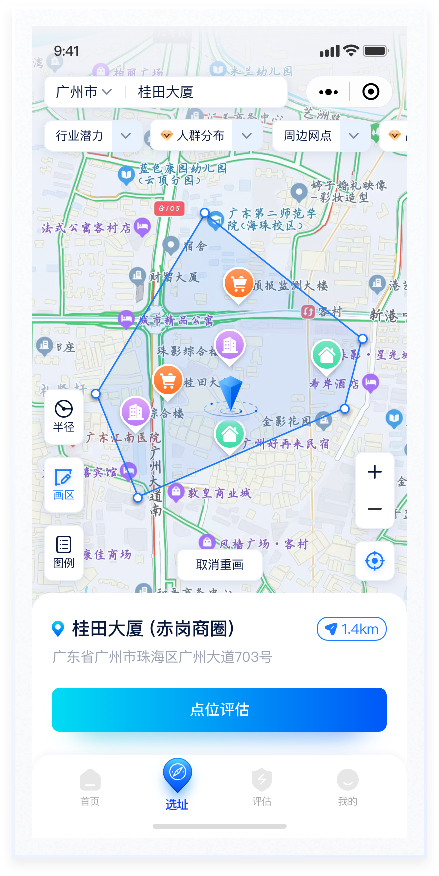 按鈕換膚在地圖上,“半徑”“選區”便于用戶對開店范圍的選擇,“圖例”則更側重圖標說明性。“放大”“縮小”“定位”則是對顯示內容的操作。